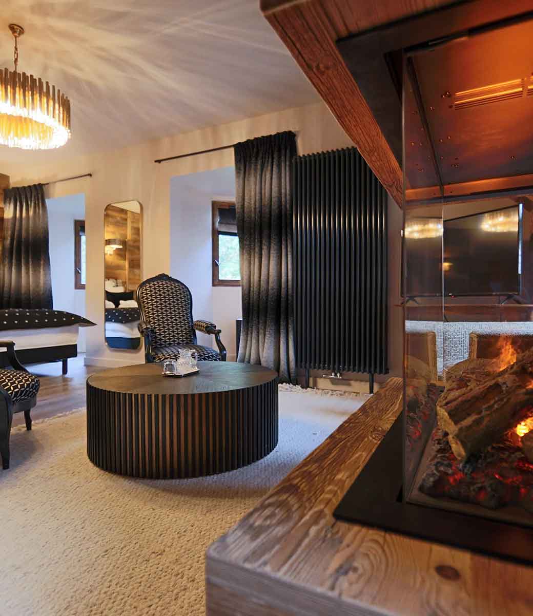 Des matières nobles et naturelles, du vieux bois de montagne, une belle cheminée, des tentures en laine Arpin ™, des couleurs chaudes, des meubles patinés et chargés d’histoire, des détails pensés pour vous être utiles. Une chambre sans balcon qui vous marquera par sa vue directe sur la montagne du Rissiou.